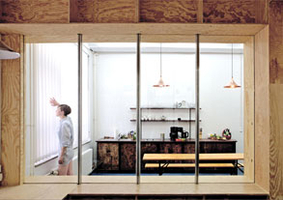 Everything becomes functional, clear and in a redundant sequence arranged to a spatial shape. The functionality of the spatial shape has to be considered only as the spine of human imperfection, though. Through mobile and movable elements the room can be adjusted accordingly to different situations. Glass walls enable wide viewing axes in the room but create also a reserved spatial separation. Spacious closets and storage space offer sufficient room for the artistic equipment and enable free interior space simultaneously. The usage of wood, steel and glass underlines the aesthetic opinion of the artist.”